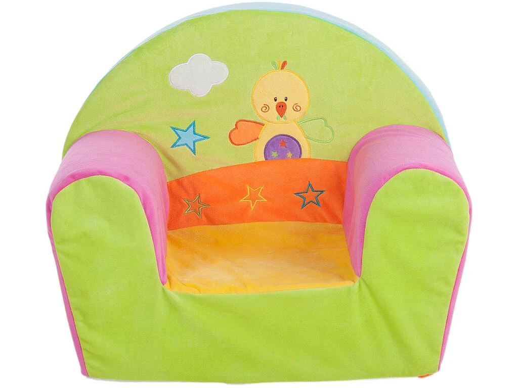 Consigue este precioso sofá infantil, con colores llamativos, un divertido dibujito de un pollito y tacto muy suave y cómodo.