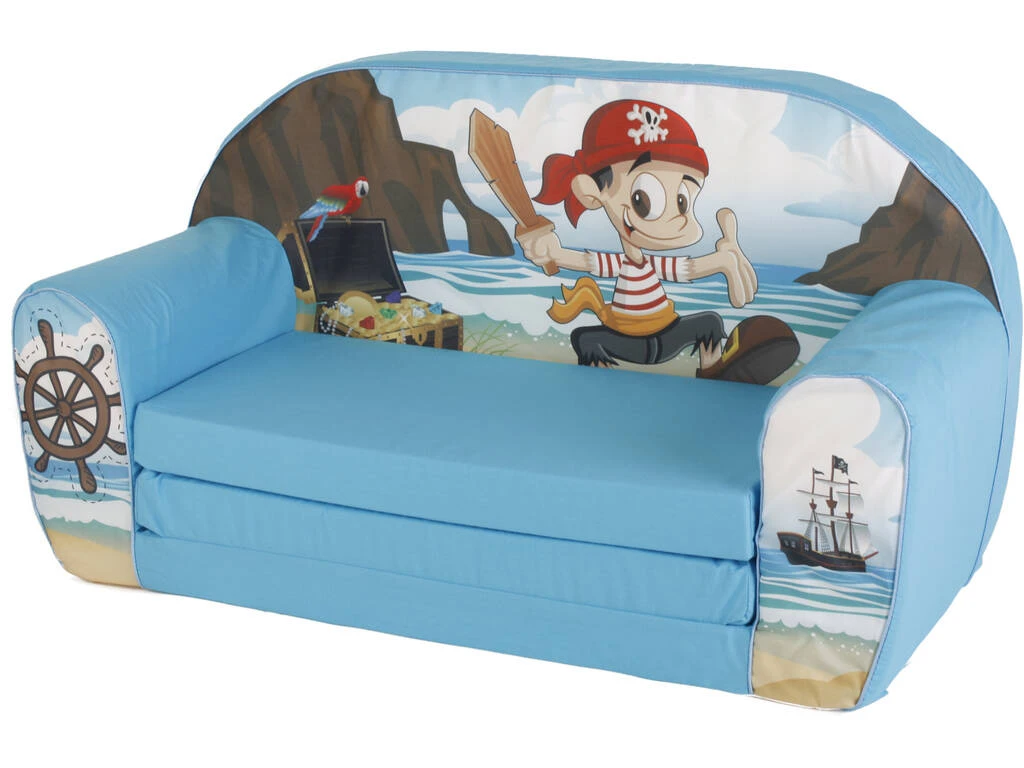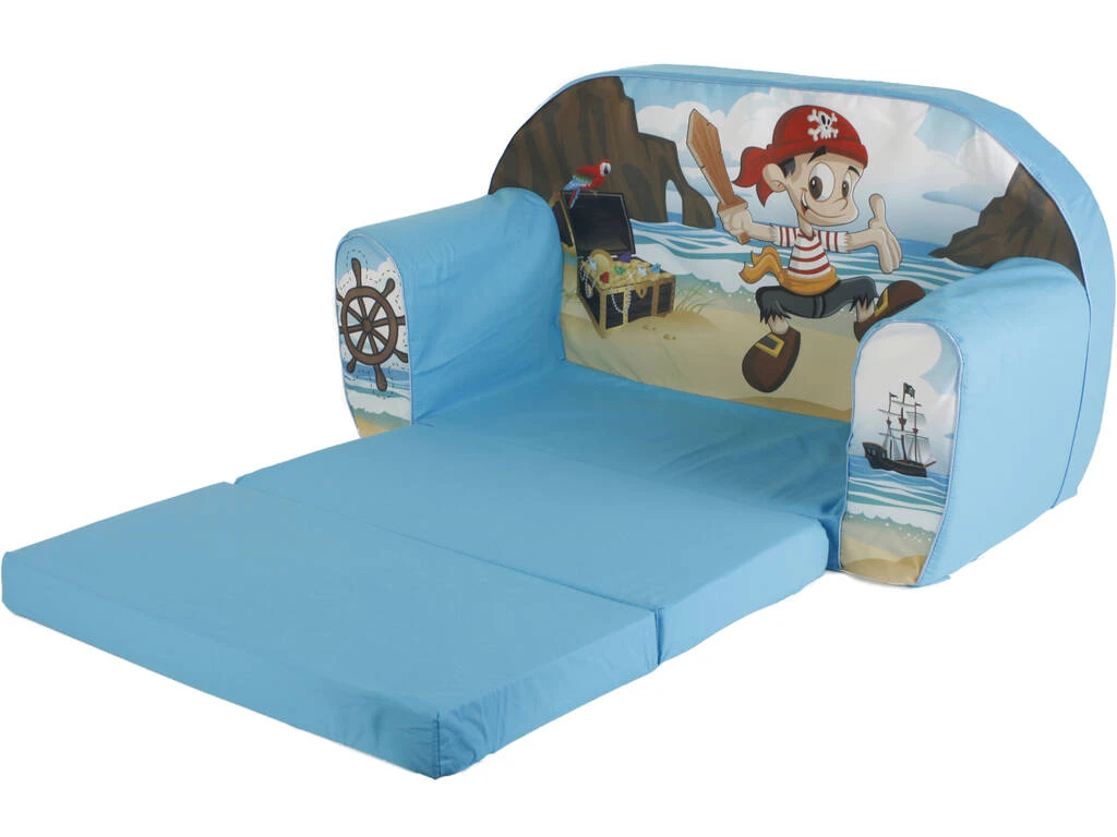 El sofá está decorado en color azul y con imágenes de un pirata, su barco y un gran tesoro con loro y todo. El sofá puede transformarse fácilmente en una improvisada cama, para que los más pequeños descansen cómodamente a la hora de la siesta.