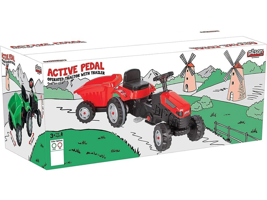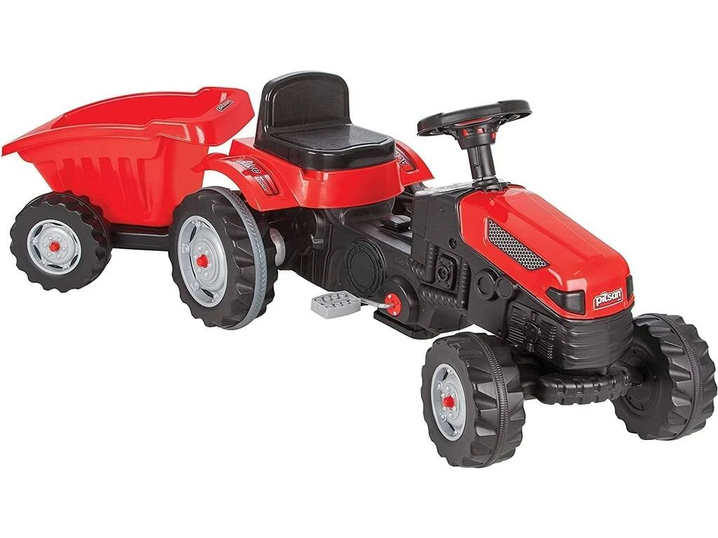 Estupendo tractor a pedales con remolque, ya sabes si te gusta jugar en el campo, seguro que tienes un montón de trastos que transportar y pasarlo genial llevándolos de un sitio a otro, herramientas, materiales de construcción o incluso la cosecha del mes.