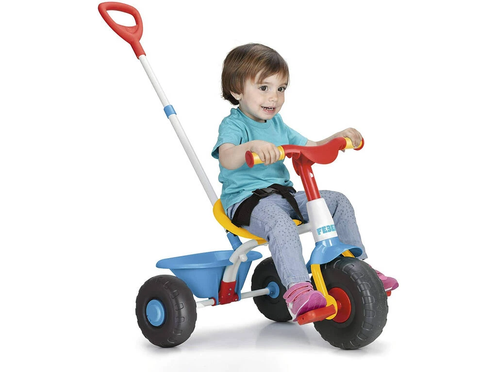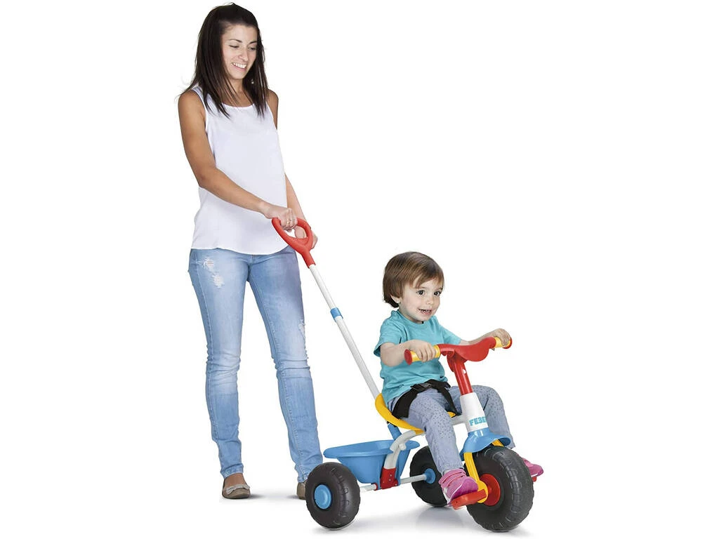 Incluye: 1 triciclo Feber Baby Trike con mango para adultos, cinturón de seguridad y bandeja portaobjetos abatible.