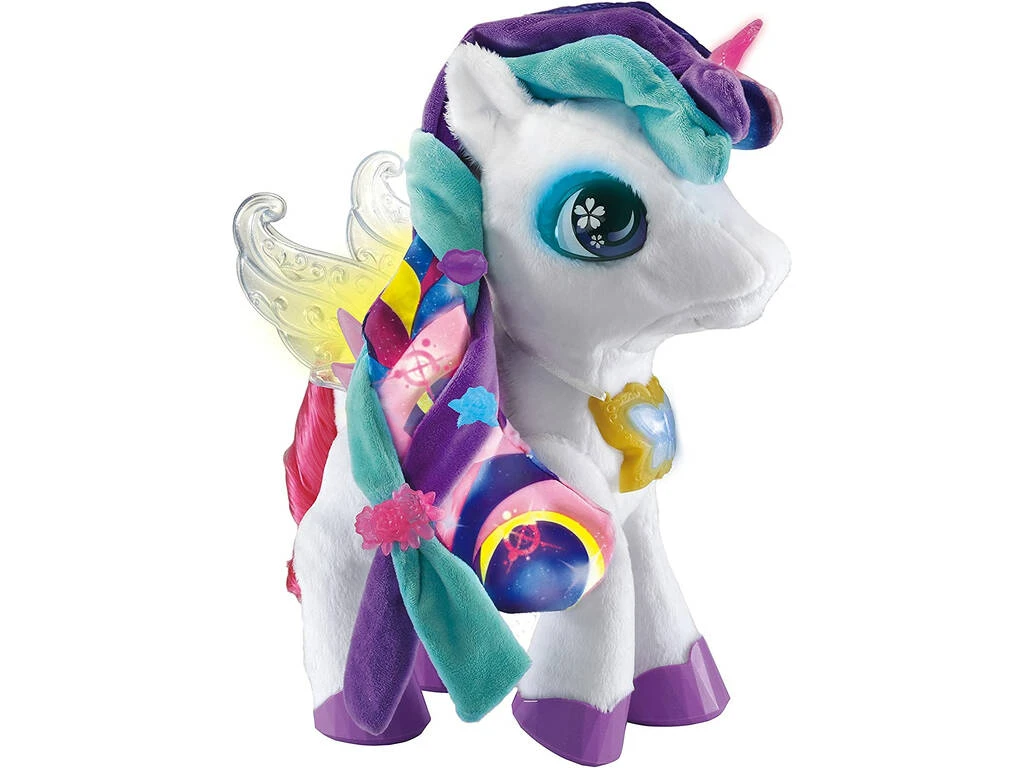 Incluye: 1 unicornio Skyla Maquillaje Mágico con luces y sonidos, 1 varita mágica, 1 peine azul y 7 adornos para el pelo del unicornio.
