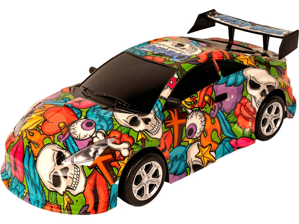 Sorprende a todos con un increíble deportivo de gran tamaño con un estilo nunca visto antes, un coche de fricción lleno de graffitis que le dan un aspecto colorido, rompedor y de lo más divertido. Los más peques podrán tener el control de este gran coche y poner a prueba junto al resto de vehículos, calaveras, ojos, coronas, sobres, flechas un un sin fin de diseños sobre la carrocería de este increíble coche deportivo.