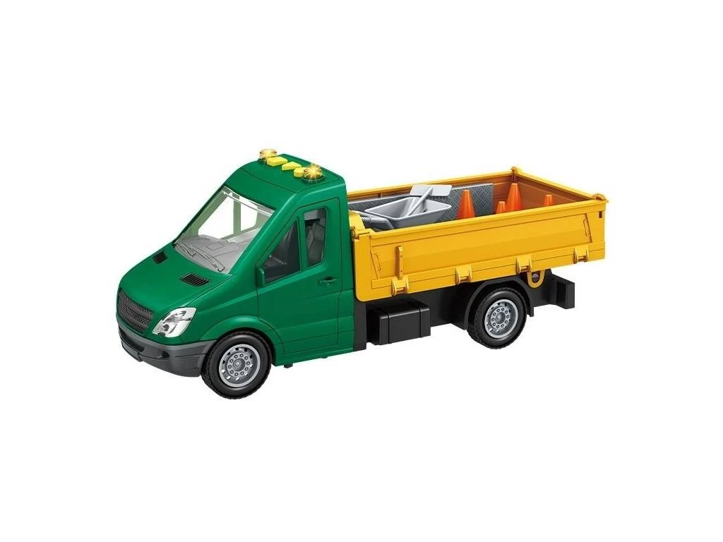 Incluye: 1 camión de color verde y amarillo con luces, sonidos, ruedas de goma, puertas que se abren y caja abatible con laterales articulados, 4 conos, 1 carretilla, 1 pala y más accesorios de juego.