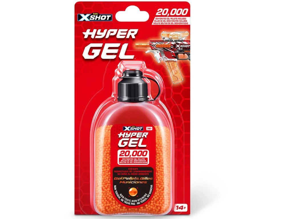 Consigue este nuevo y práctico bote lleno de bolitas deshidratadas, con las que disfrutar de los nuevos lanzadores Hyper Gel de X-Shot al máximo nivel. Una botella de recarga llena de bolitas de gel, que has de hidratar, para después llenar los cargadores de tus nuevos y precisos lanzadores.